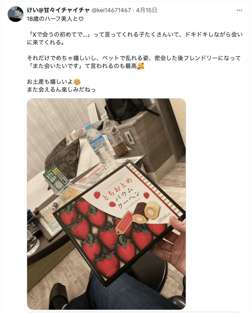 SさんはXで男性と会うのは初めてでしたが、DMはけっこう盛り上がって、学校が休みの日曜日に会うことに。